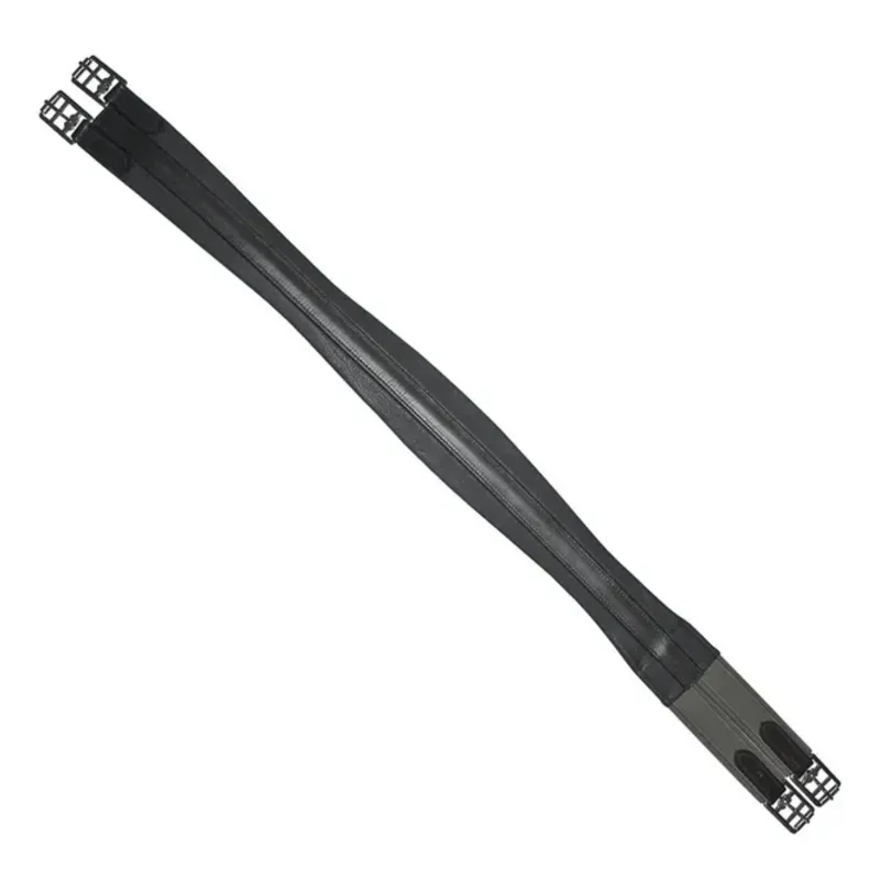 A padded leather girth with stainless steel fittings and elastic at one end.