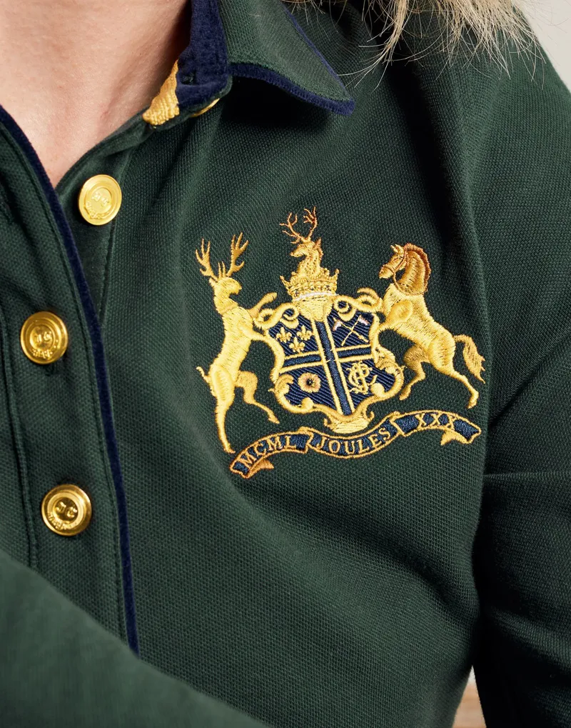 Combining a traditional polo style with a feminine shape, the Ashley is a must for your wardrobe. It has a slim fit that hugs the body and is made from soft cotton pique with added stretch. Elevating it beyond a ‘basic’ polo is the plush velvet undercollar and trim as well as the gold metal buttons. An intricate Joules polo club badge has been embroidered to the chest along with embroidered polo mallets and the player number 3 embroidery to the outer back neck.