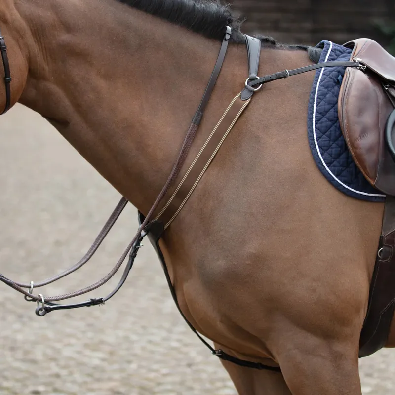 This performance breastplate comes with a running martingale attachment (which is detachable), a wide padded strap across the wither plus clip fastenings which attach quickly and easily to the saddle D rings.