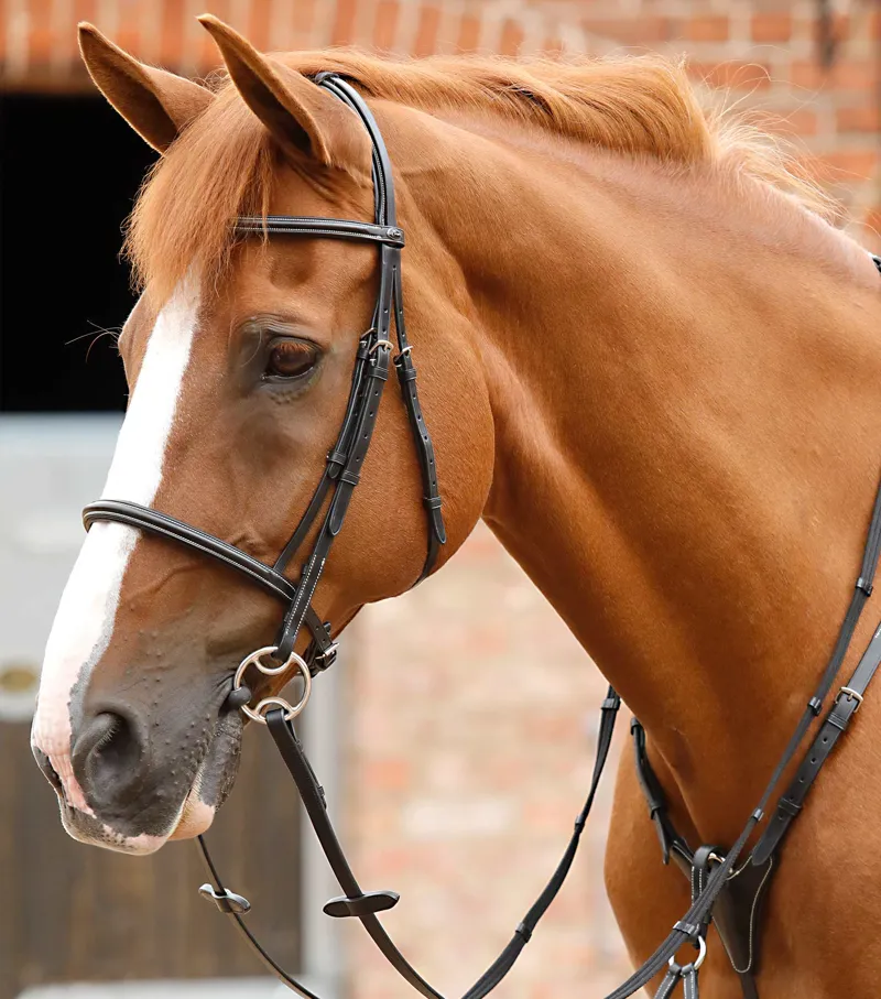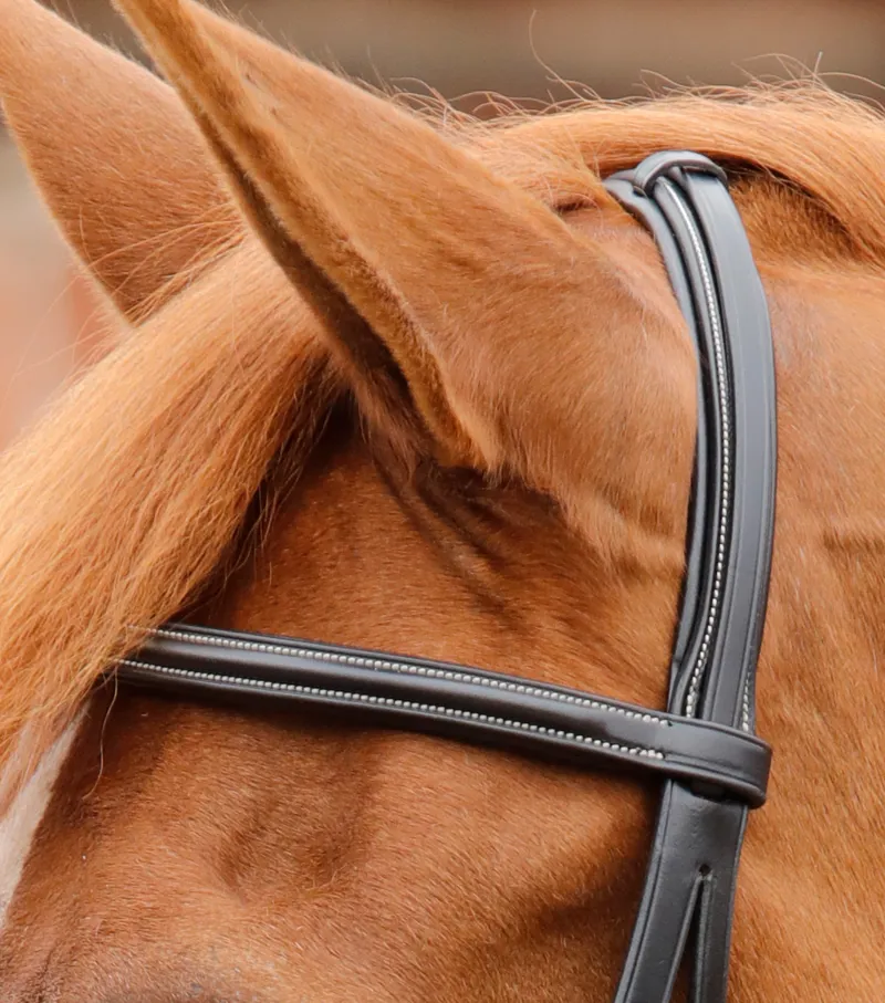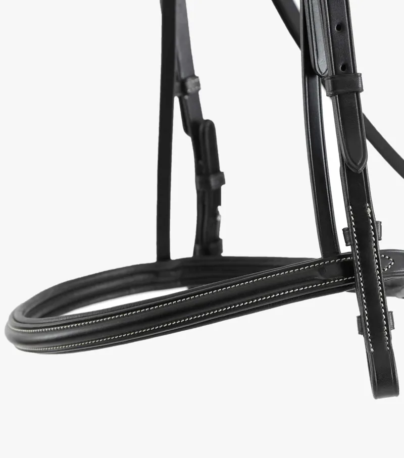 Delicately styled, this cavesson noseband bridle features beautiful contrast stitching and finer leather straps for a more refined, elegant appearance. The padded poll piece enhances comfort and the noseband is secured over the top, ensuring an even pressure is applied for heightened performance. The round raised browband is padded and features two rows of detailed contrast stitching which really helps this bridle stand out from the rest.