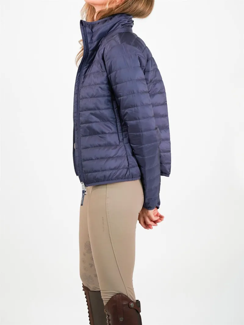 Light-weight quilted jacket with tall collar. Surface is shiny, and water resistant for soft rain, with contrast colored lining. Flattering fit with two-way zipper at front. Discrete and stylish details such as hidden zipped pockets, elastic bindings and PS logo stud at neck.