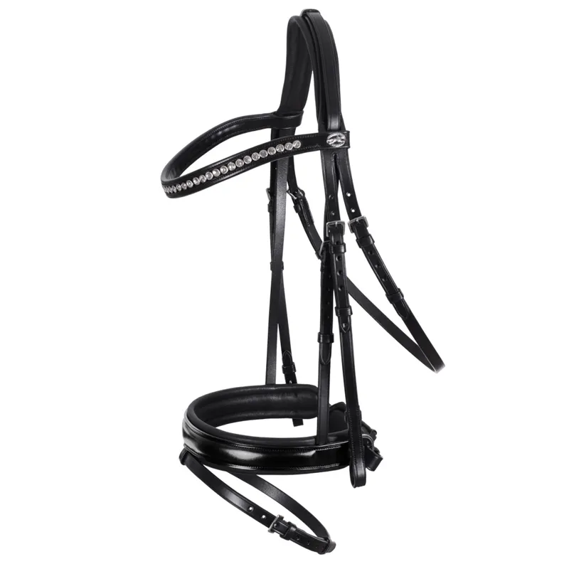An absolute eye catcher – the bridle Madrid from Schockemöhle Sports! Due tothe wide, combined special noseband and the large crystal rivets thebridle is not only an optic attraction. It also convinces by the linedheadpiece with the overflowing noseband. Rounded off by the new logobutton, you will be an immediate eye-catcher, whether at the nexttournament or on the next ride-out.