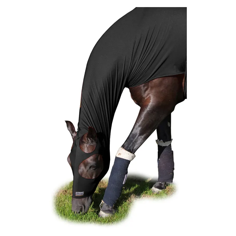 Made of the highest quality 4-way stretch lycra mix, these hoods will fit snugly, stay in place and not pull back. Made with large eye holes and a comfortable easy-fit girth and elasticated strap through the front legs, once fitted and the horse or pony is upright, there should be some wrinkling in the neck. When the horse or pony drops his/her head, there is plenty of stretch in the fabric as well as the excess material in the neck.